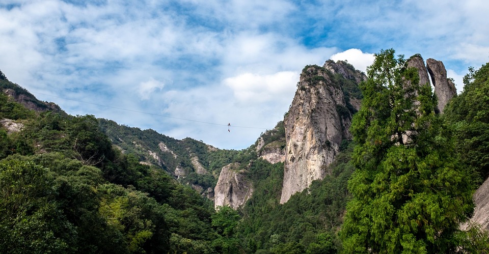 【靈岩景區】靈岩位於雁蕩三絕正中央,被視為雁蕩山的「明庭」,以靈岩古刹為中心,其後的屏霞嶂高廣數百丈,五色相間,高聳入雲,左右由天柱、展旗二崖對峙,壁立千仞;渾然天成的龐大山體讓人萌生對天地萬物的肅穆之感,人處其中,頓覺萬慮俱息。我們將在此欣賞靈岩飛渡表演,表演者在天柱峰和展旗峰寬高各為 200 多米的懸崖峰頂,表演直渡和橫渡。懸崖飛渡始於30年代,村民們為了採石斛蘭賣錢養家,常身繫繩索,沿著崖壁懸空採擷,因而練就出一身飛簷走壁的本領,精采的演出經常贏得現場觀眾熱烈的歡呼與掌聲。
