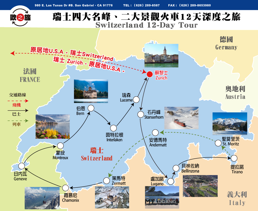 瑞士四大名峰、二大景觀火車12天深度之旅 (2026夏季) |